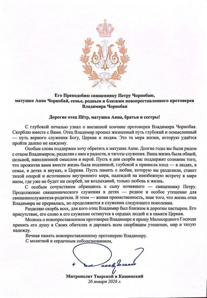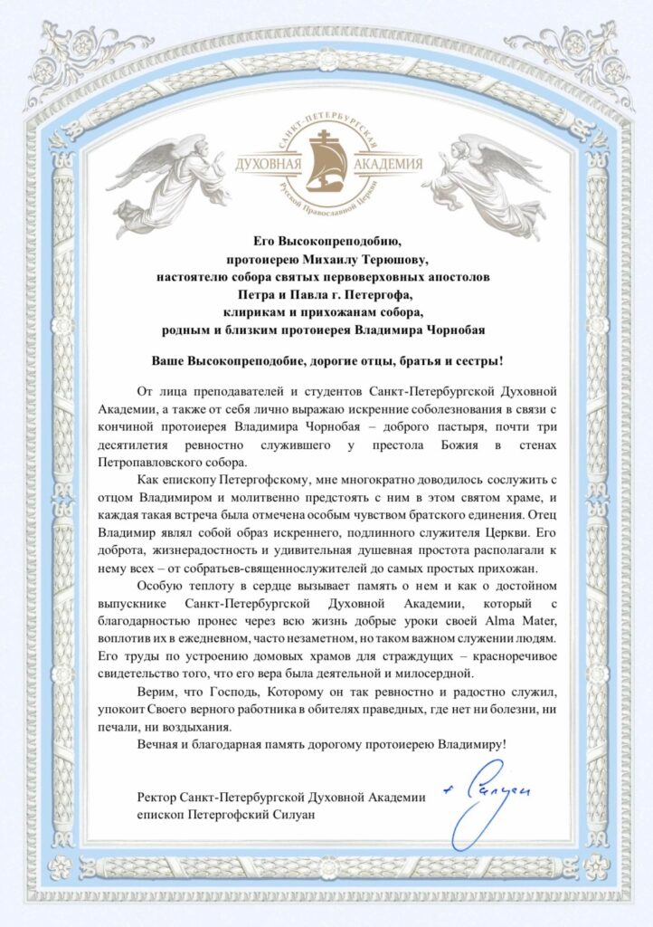 Митрополит Санкт-Петербургский и Ладожский Варсонофий 24 января выразил соболезнование в связи с кончиной клирика собора апостолов Петра и Павла в Петергофе протоиерея Владимира Чорнобая. «Господь призвал почившего к служению Церкви Христовой в зрелом возрасте после обучения в Санкт-Петербургских духовных школах, — сказано в послании. — Новопреставленный почти тридцать лет ревностно совершал его в Петергофе, являясь штатным …