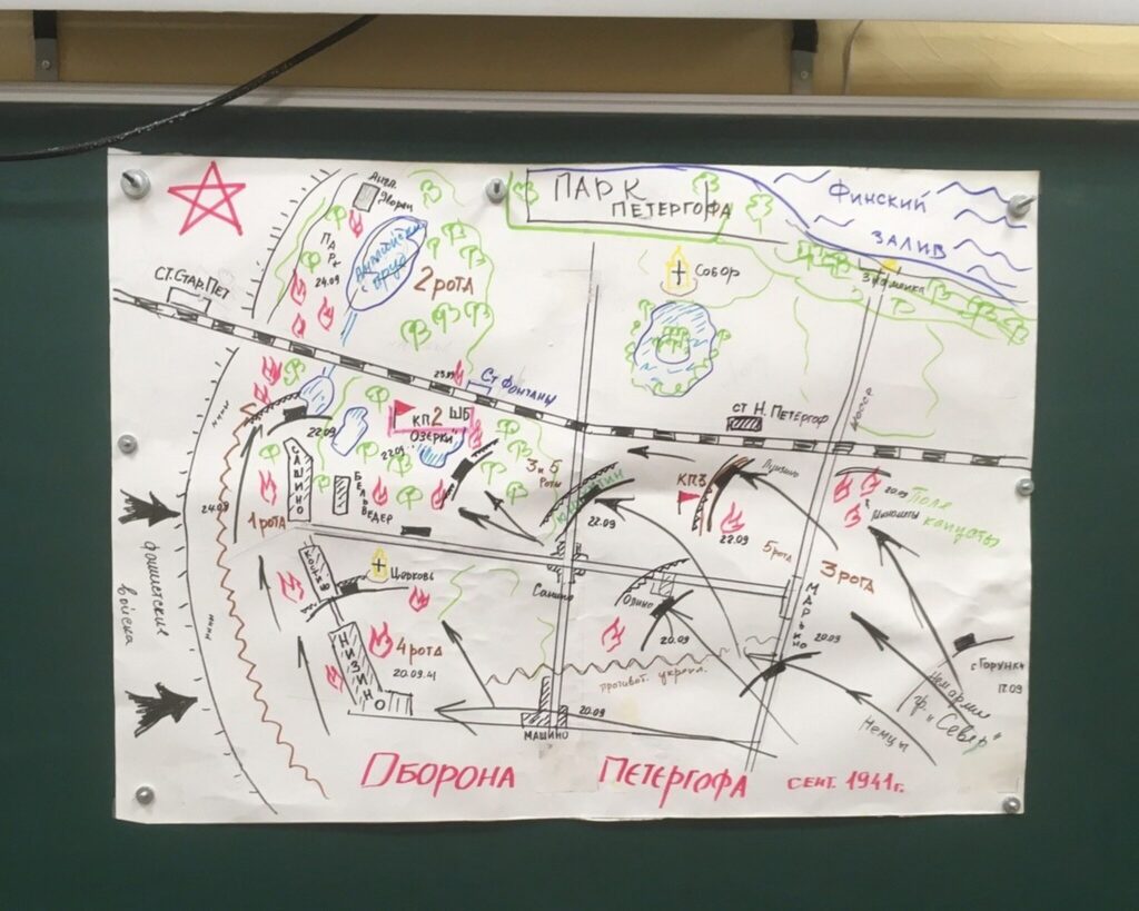 Первая станция называлась «Оборона Петергофа». Педагог школы Галина Федоровна Шмелева рассказала о том, как развивались события в нашем городе во время Великой Отечественной. Говорила, как собирали в Народное ополчение добровольцев Петергофа. Из них были сформированы 78-й и 79-й истребительные батальоны. В 79-й были зачислены братья Горкушенко Владимир и Глеб, комсомольцы школы 415 Толя Иванин, Лева Бушев, Саша Белов, Аня Мальцева, Лида Сапогова. Все они героически сражались и погибли. После того, как дети узнали об этих событиях и рассмотрели карту обороны, нарисованную Галиной Федоровной, началась игровая часть станции. Ребята пытались бросать «гранаты» (пустые бутылки) из дотов, сделанных из парт.