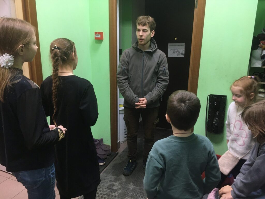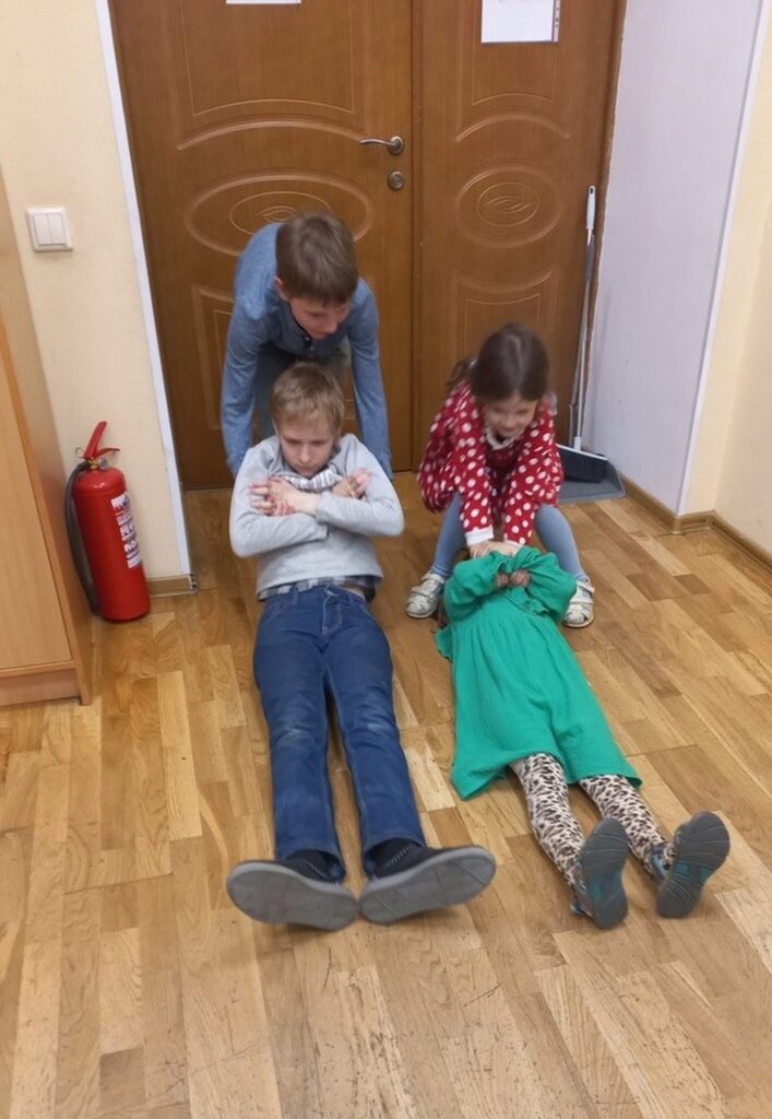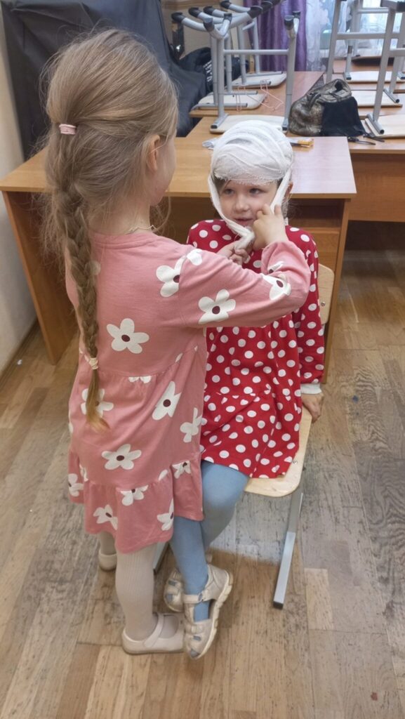Следующая станция называлась «Фронтовая медсестра». Вместе со Светланой Юрьевной Громовой это занятие проводила Настя Самухина. Сначала учились выносить раненых с поля боя. Важно делать это правильно, чтобы не нанести вреда. Во второй части учились накладывать повязку на голову. Каждый попробовал себя в роли медсестры (медбрата), а также каждый побывал в роли раненого и сфотографировался с перебинтованной головой. Третья станция – «Партизанская война». Педагог школы Дмитрий Сергеевич Волобуев рассказал о партизанском движении и показал, как разжечь костер с одной спички, даже если на улице дождь. Дети научились, как быстро зажечь бересту и как грамотно сложить дрова для хорошего костра.