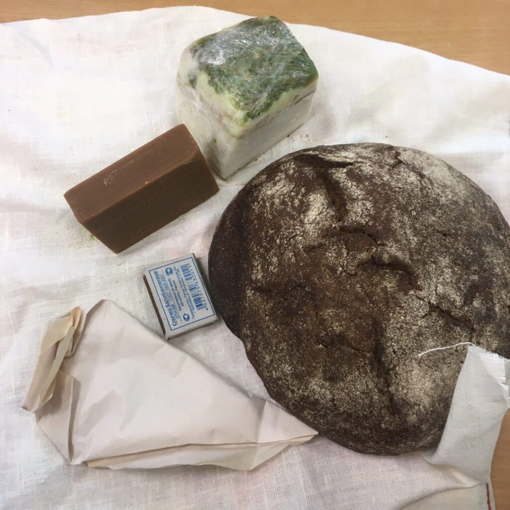 И вот, клад найден! Это черный хлеб, хозяйственное мыло, спички, кулечек сахара и сало – очень ценные во время войны продукты и вещи!