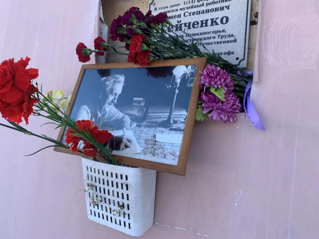 Затем собравшиеся возложили цветы к мемориальной табличке на доме, где жил Семен Гейченко. После возложения цветов и фото на память участники пешком дошли до поклонного креста, установленного на руинах храма иконы Божией Матери «Знамение», в котором в младенчестве был крещен Семен Степанович. Знаменская церковь была первым петергофским храмом. Она построена в 1709-1711 годах по повелению императора Петра I.