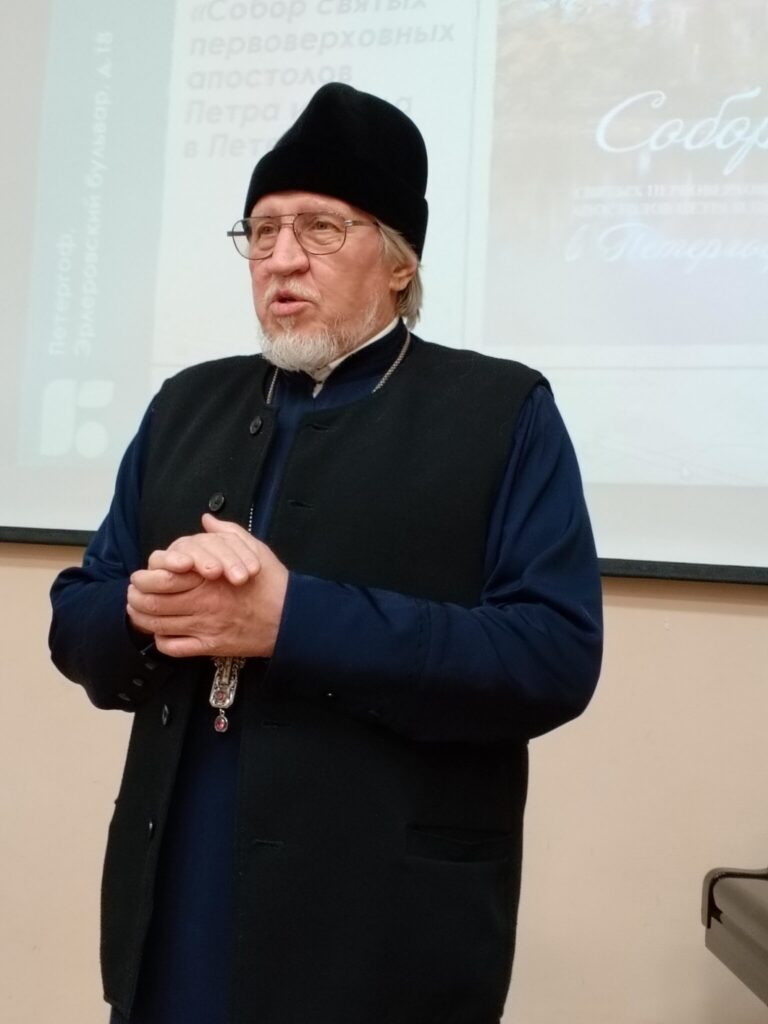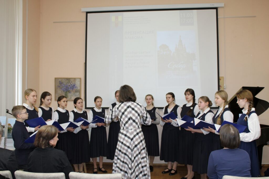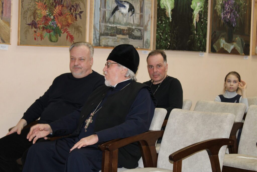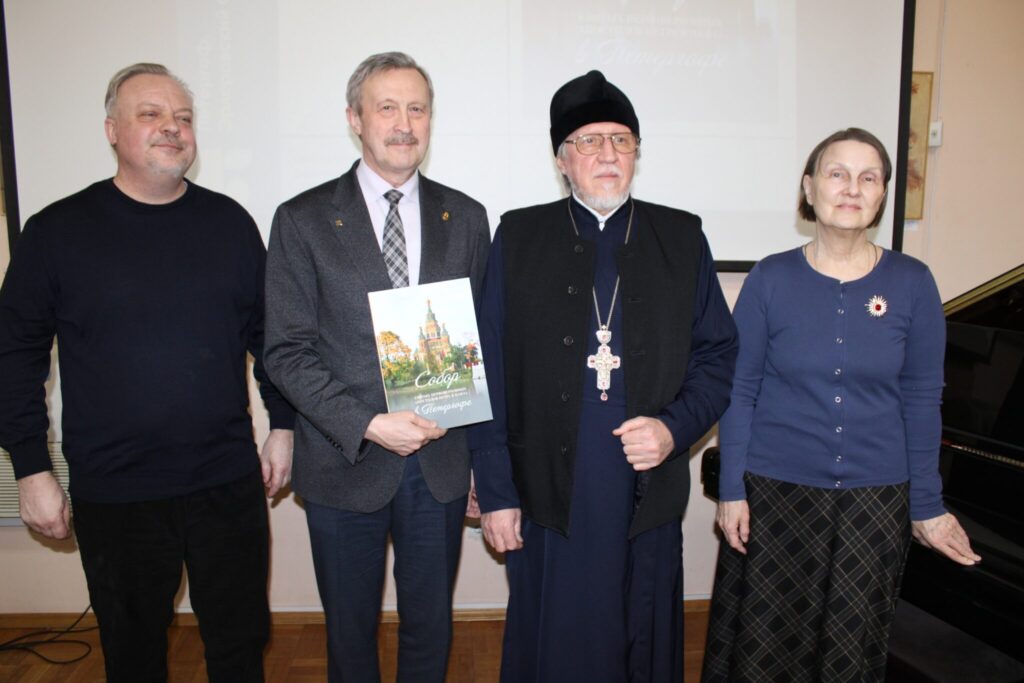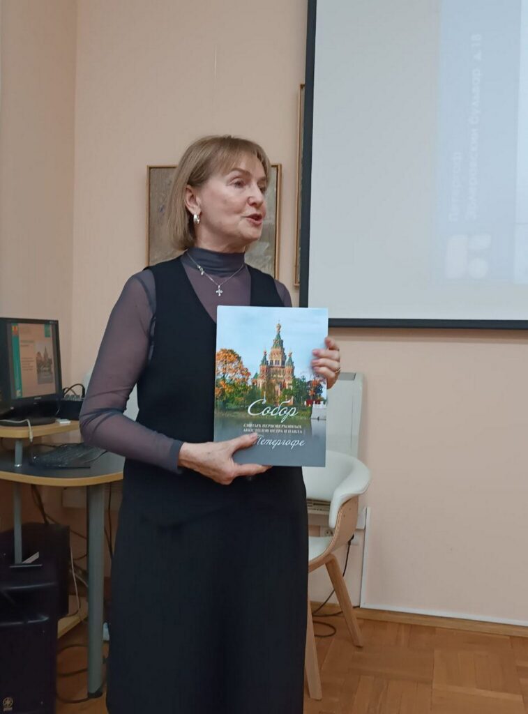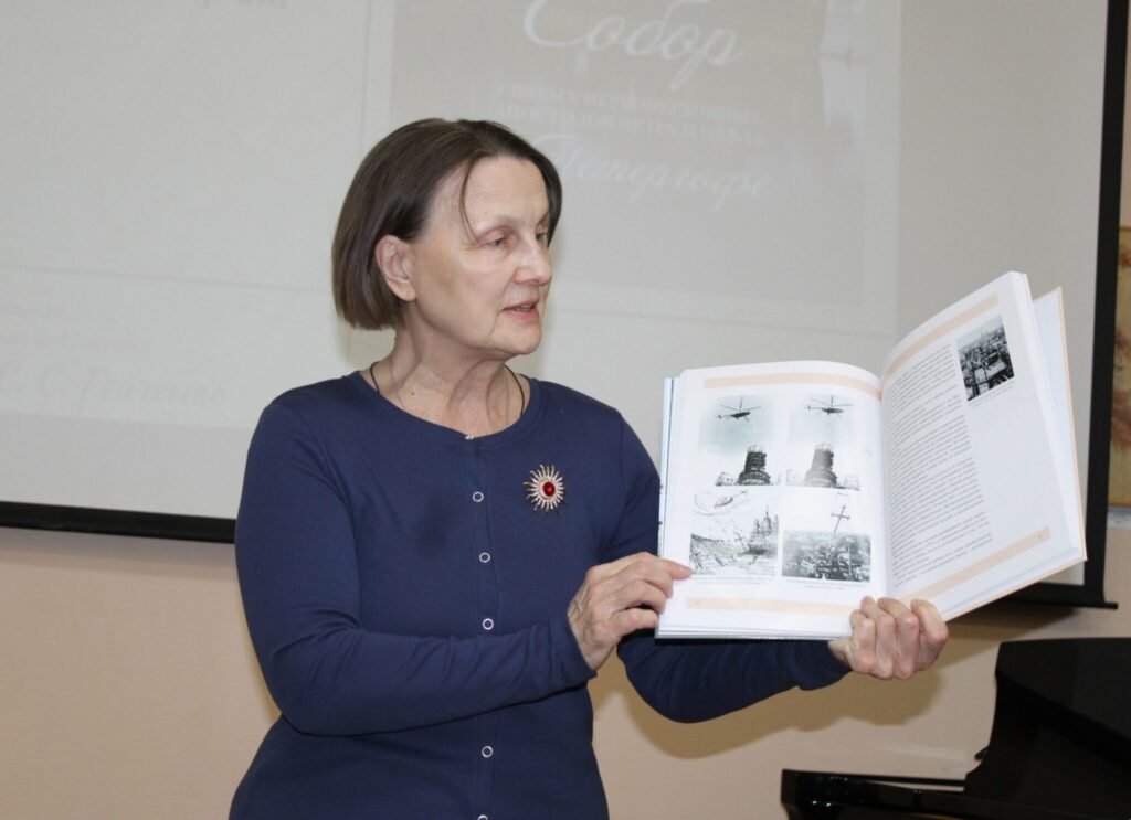 В зале находились протоиерей Михаил Терюшов, настоятель Петропавловского собора, благочинный Петродворцового округа с помощником по СМИ Наталией Сидоровой, соавтором второго издания альбома.