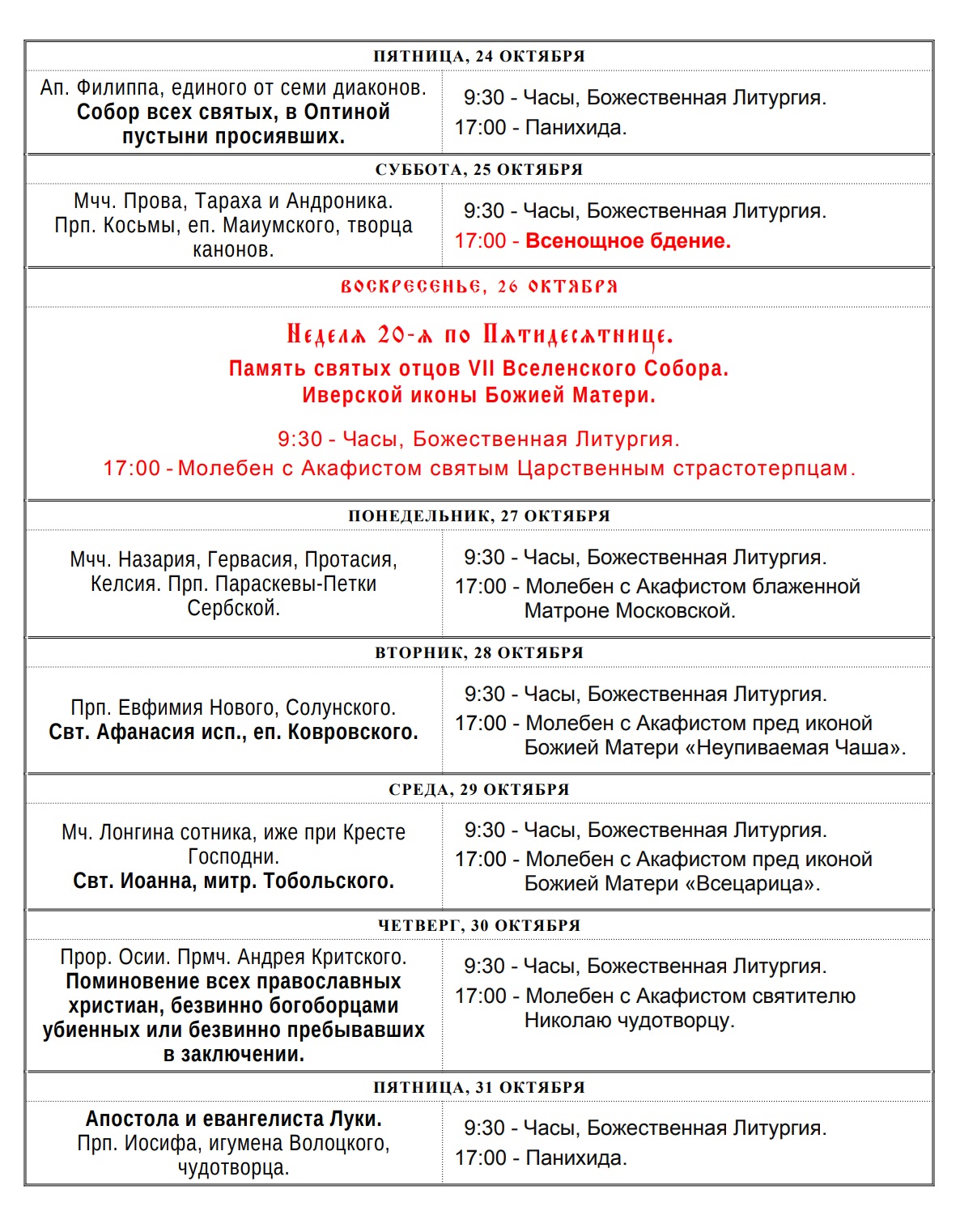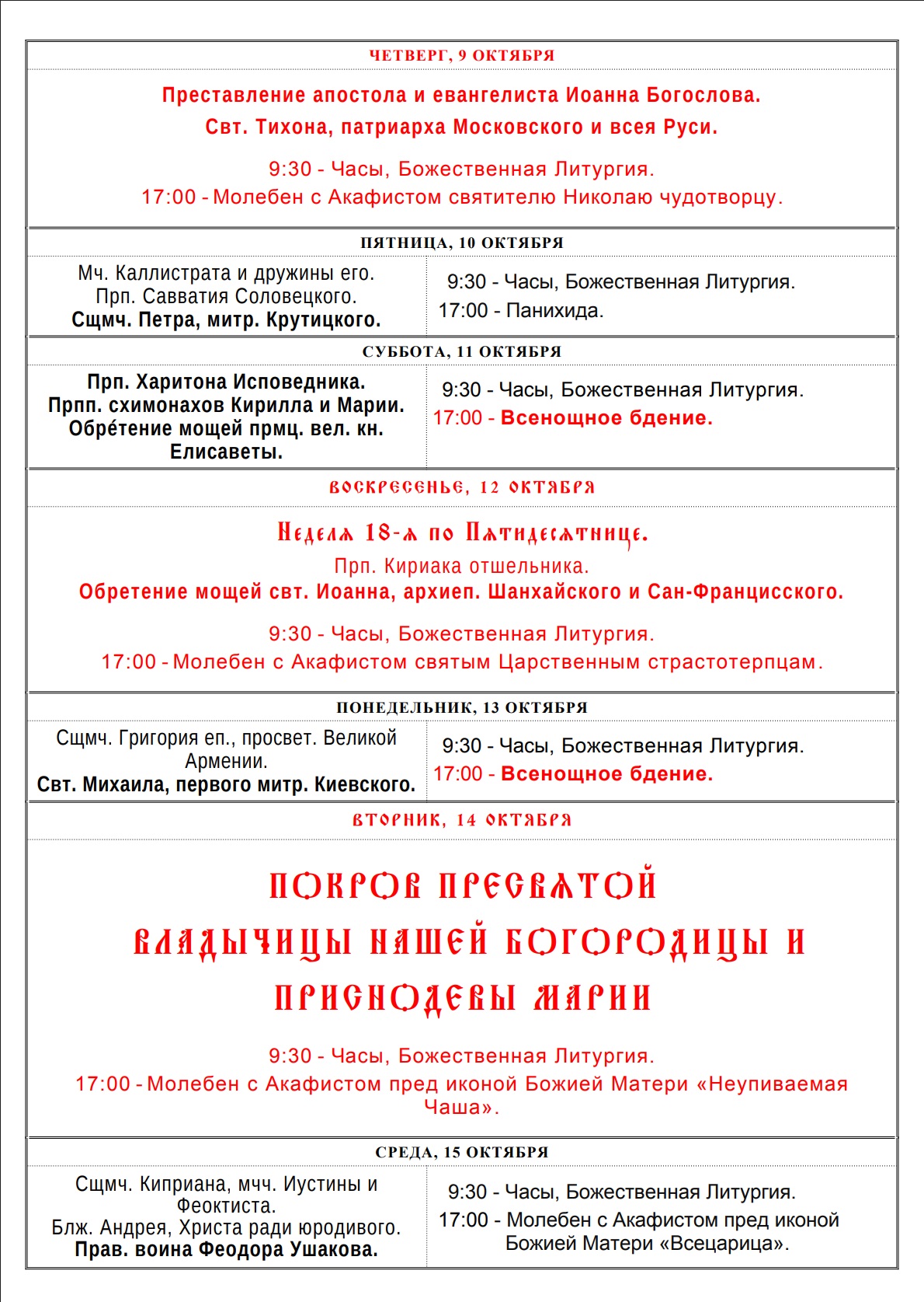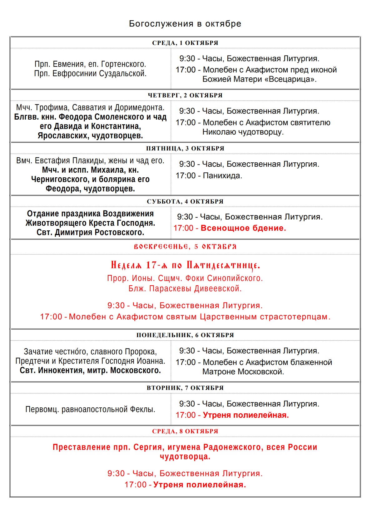 - 13 октября 202530 сентября 2025 (по ст.ст.)ПонедельникСедмица 19-я по ПятидесятницеСвятитель Михаил, митрополит Киевский и всея РусиПреподобномученицы Рипсимия и Гаиания и с ними 35 девСвященномученик Петр Соловьев, пресвитерСвященномученик Вячеслав Занков, пресвитерСвященномученик Петр Пушкинский, пресвитерСвященномученик Симеон Лилеев, пресвитерСвященномученик Василий Гурьев, пресвитерСвященномученик Александр Орлов, пресвитерСвященномученик Серафим Василенко, протодиаконПреподобномученица Александра (Червякова), схимонахиняМученик Алексий СеребренниковМученик Матфей СоловьевМученица Аполлинария ТупицынаСвященномученик Григорий Армянский, просветитель Великой Армении, епископПреподобный Григорий Пельшемский, Вологодский, игуменСвященномученик Прокопий Попов, пресвитерПреподобномученица Гаиания Армянская, игуменияПреподобномученица Рипсимия Армянская, деваИн.10:1–9, Флп.1:1–7, Лк.6:24–30,, Лк.6:37–45, Евр.7:26–8:2, Ин.10:9–16, Мф.24:42–47